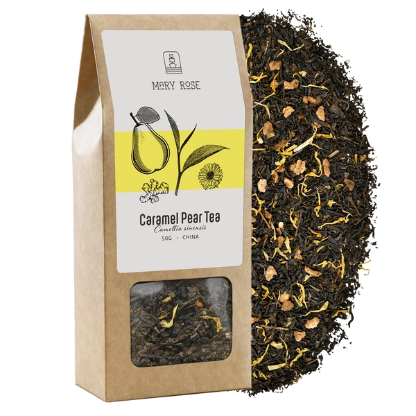 - Mary Rose Caramel Pear is a tea composition ideal for long autumn evenings. A sweet and spicy combination of black yunnan tea, pear, ginger and natural caramel aroma.