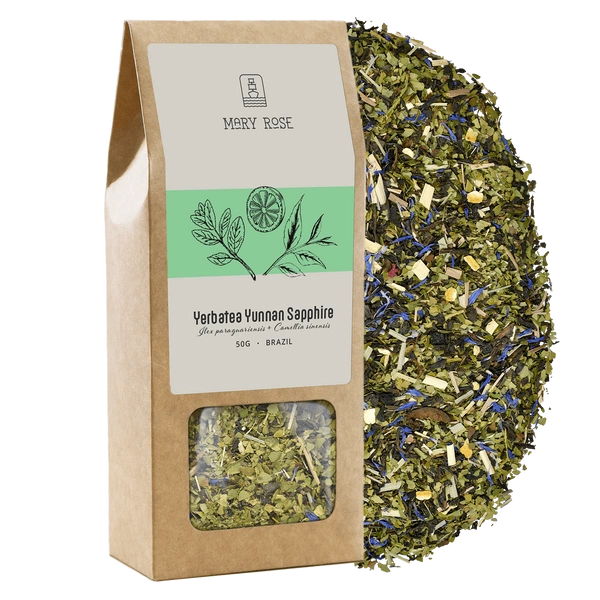 - Mary Rose Yunnan Sapphire yerbatea combines Brazilian green yerba mate with the intense flavour of yunnan black tea. This composition also includes cornflower petals, lemon peel, dried chokeberry and lemongrass.
