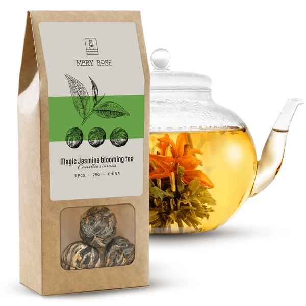 - Mary Rose Magic Jasmine to herbata kwitnąca, która zachwyca nie tylko wyjątkowym smakiem i aromatem, ale przede wszystkim swoją zjawiskową formą.