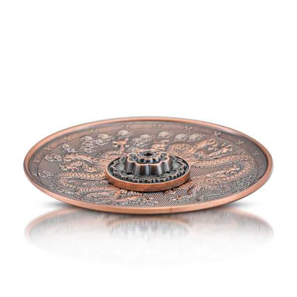 Okrągła podstawka pod kadzidło „Dragon" to praktyczny dodatek inspirowany kulturą Dalekiego Wschodu. Wykonana z solidnego stopu cynku, urzeka pięknym wzornictwem, w którym królują dwa smoki – symbole mocy, odwagi i wewnętrznej harmonii. W tradycji chińskiej smoki są opiekunami ludzi, przynoszą szczęście i ochraniają przed negatywnymi wpływami. Centralną część podstawki ozdabia subtelny chiński znak oznaczający błogosławieństwo. Środkowa część podstawki w formie mandali ułatwia korzystanie z kadzidełek patyczkowych. Wyposażona jest w niewielki otwór, dzięki któremu kadzidło stabilnie spoczywa na swoim miejscu, a popiół trafia bezpośrednio na podstawkę, pomagając w zachowaniu porządku.