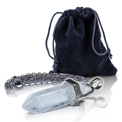 Pendant with rock crystal in pouch + chain